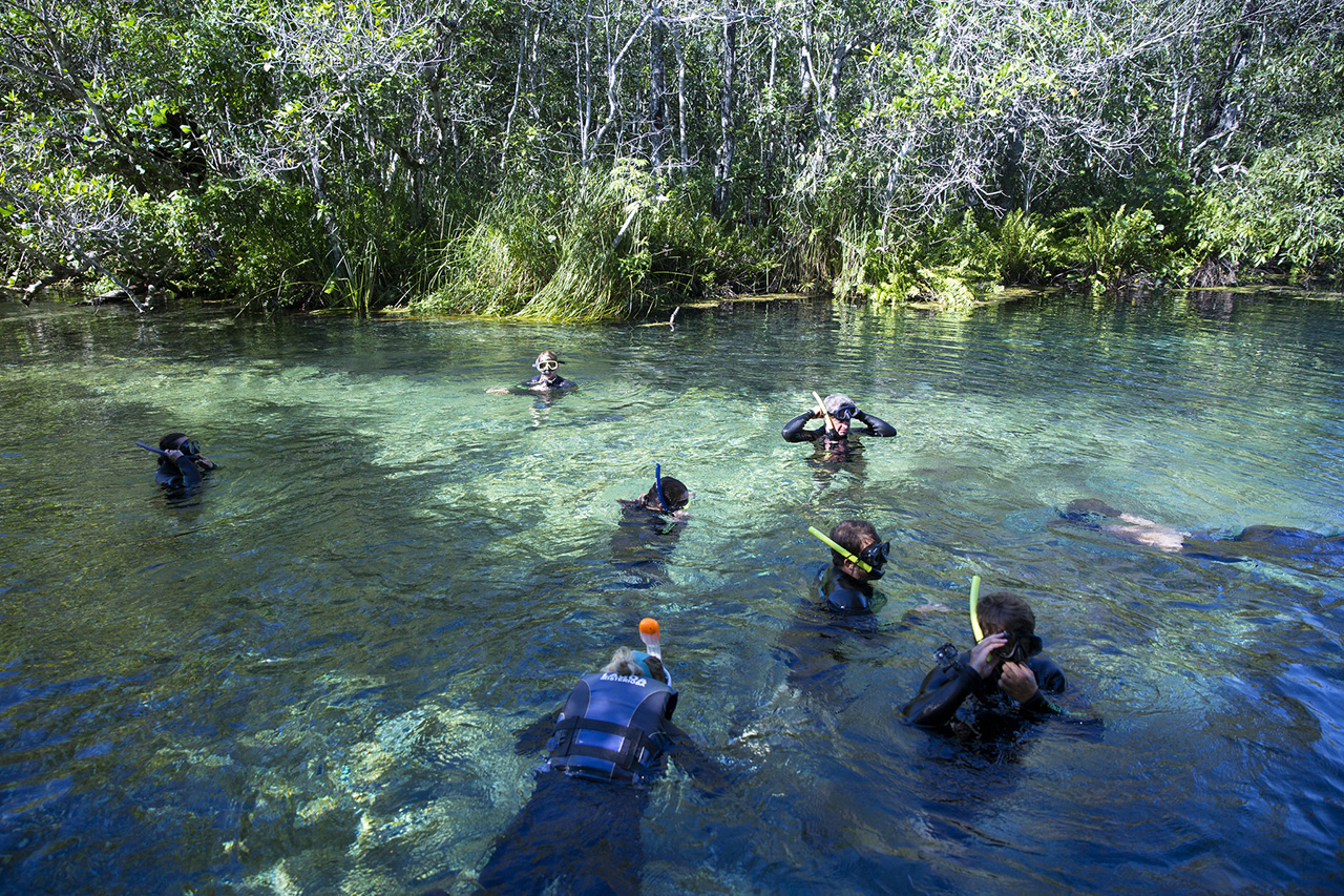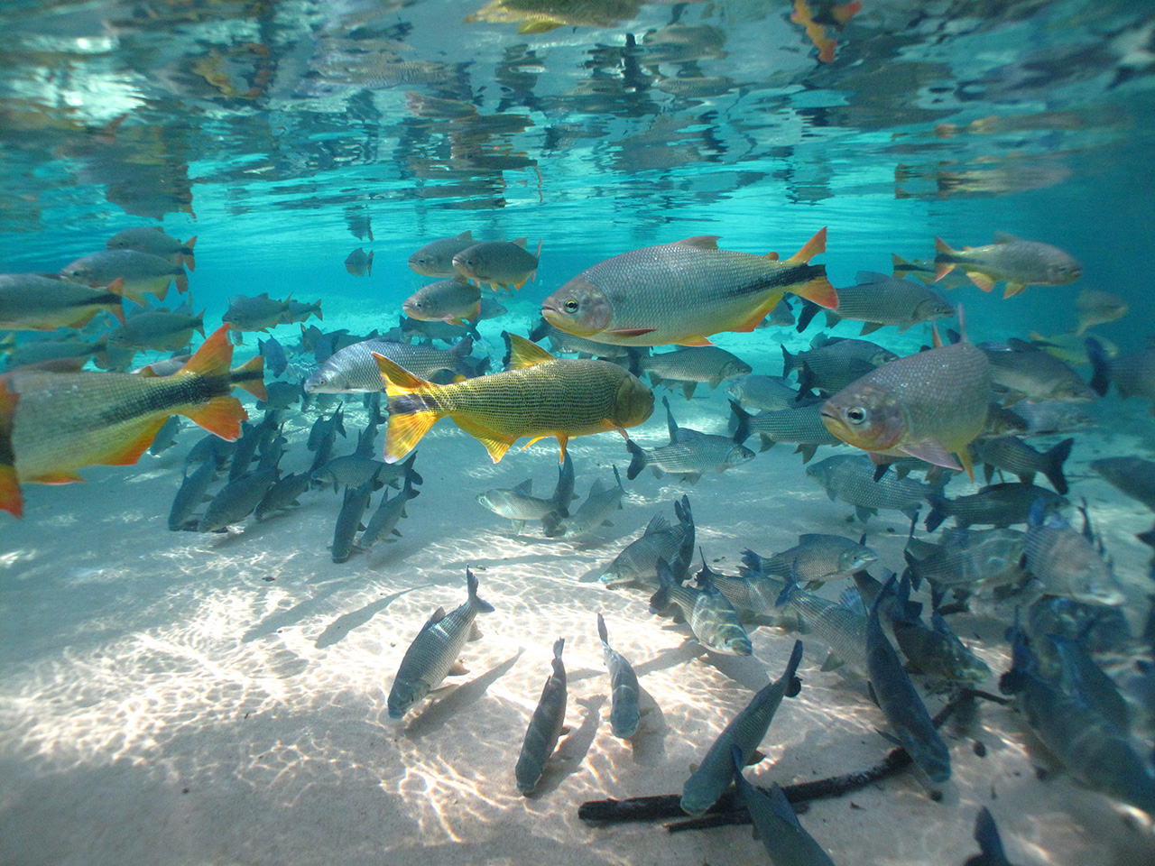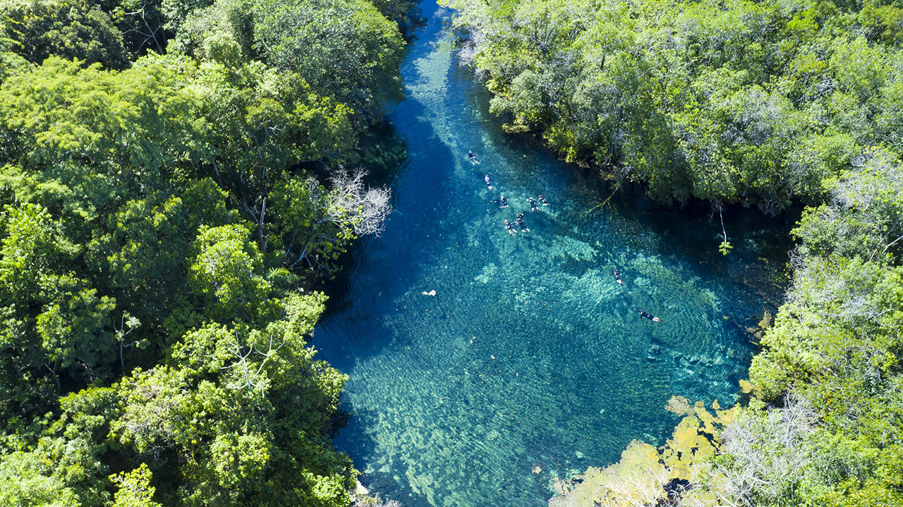 A forest trail leads through riverine forest to a point where you plunge into the Olho D’Água a crystal-clear creek that feeds the Rio da Prata river. The guide provides thorough instructions and a safety briefing before setting off. Snorkeling (in buoyant wetsuits) requires hardly any effort as the gentle current carries you past schools of colourful fish, submerged branches and underwater scenes that reminds one of a tropical aquarium. Of equal beauty are the towering trees with branches that stretch and embrace each other above. Before or after your tour (depending on your starting time) a delicious regional lunch awaits – simple but tasty food with a variety of meat, fish, some vegetarian dishes and desserts to die for! After lunch, take time to rest in one of the many hammocks or interact with resident macaws.